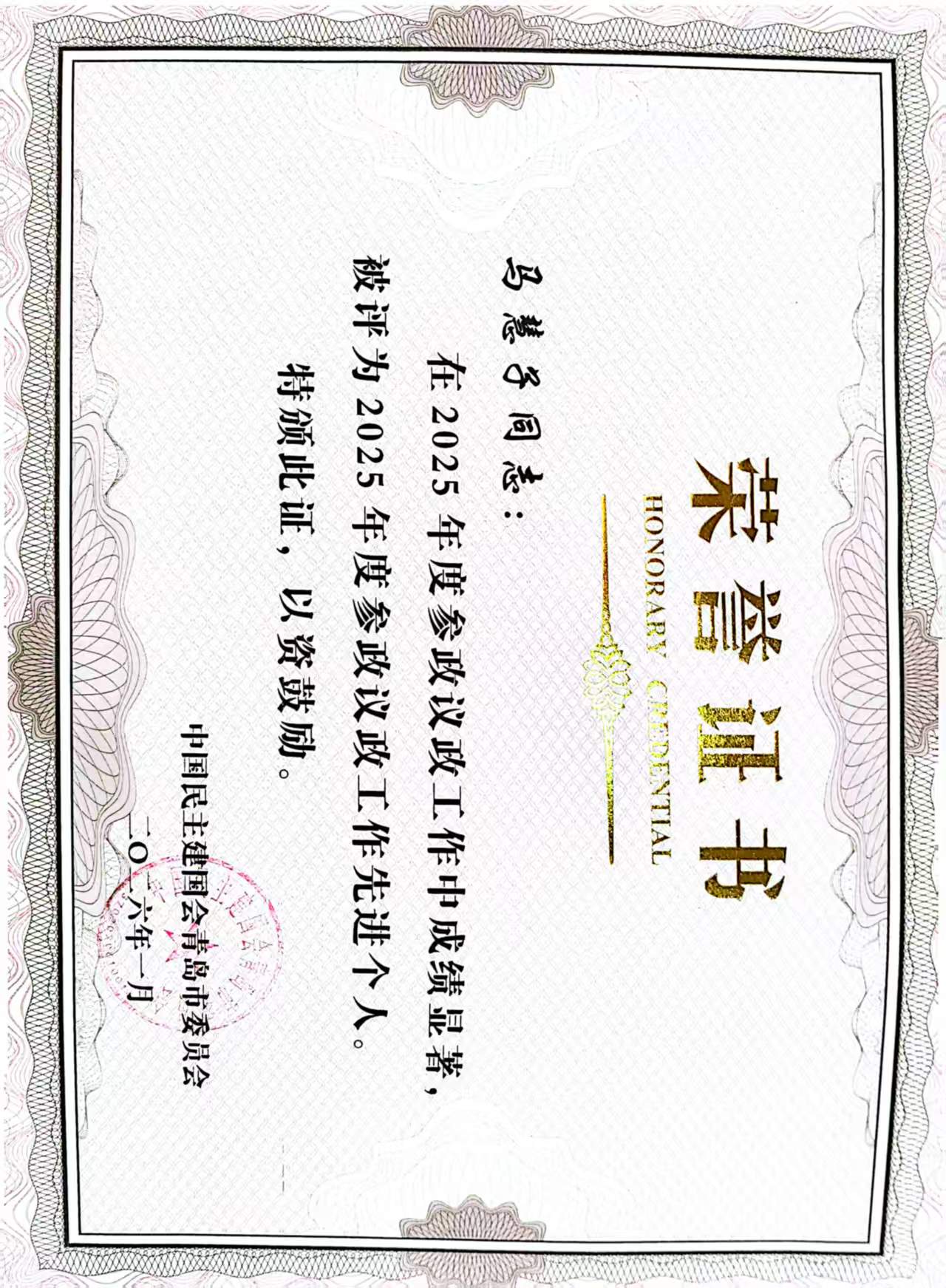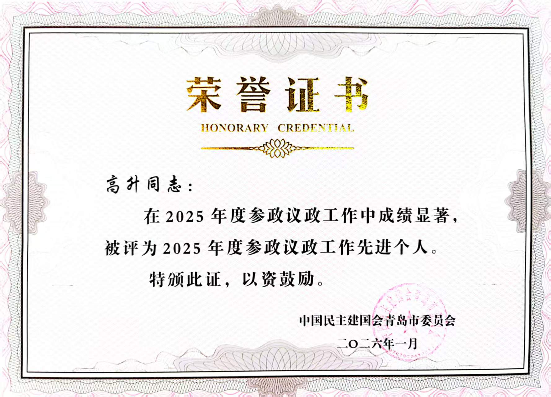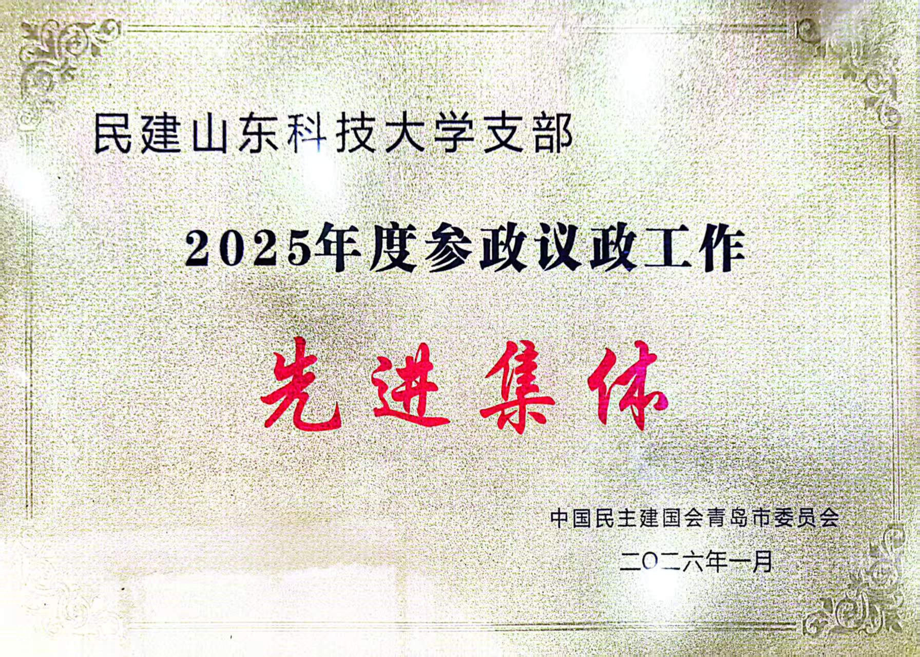 民建山东科技大学支部荣获民建青岛市委会颁发的“2025年参政议政工作先进集体”,支部主委高升、会员马慧子被评为“2025年度参政议政工作先进个人”,会员杨永杰被评为“2025年度社会服务工作先进个人”,支部提交的2篇成果被民建山东省委会评为“2025年度全省参政议政优秀成果”,10篇成果被民建青岛市委会评为“2025年度优秀参政议政成果”。